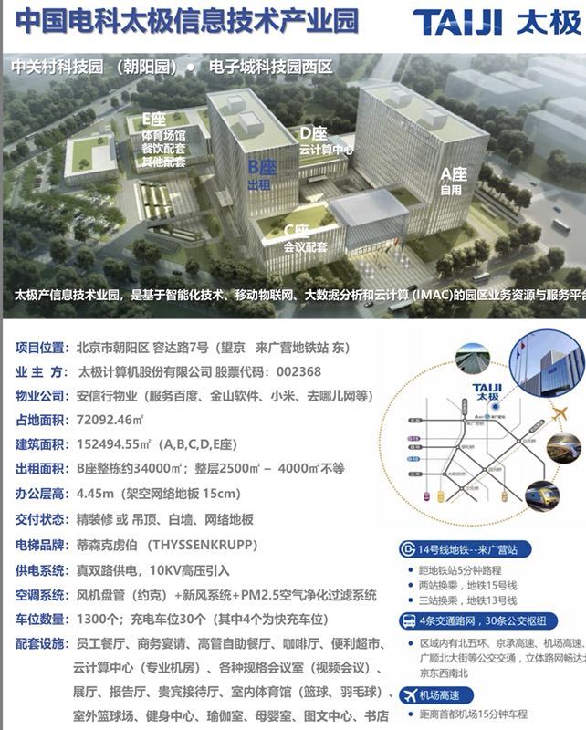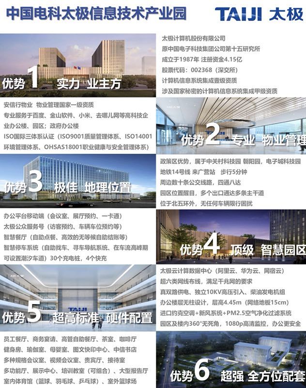 中国电科太极信息技术产业园位于北京市朝阳区电子城科技园区,占地面积73亩,2014年3月31日破土动工,2016年10月23日工程竣工,历时两年七个月。太极产业园遵循“现代简约、稳重大气、科技精致”的设计风格,园区整体呈“四合院”布局,包括三座科技办公楼租赁项目、云计算数据中心、测试中心共五个单体建筑,总建筑面积15万平米,可容纳6000人入驻。产业园全面应用太极自主“智慧园区”解决方案,运用物联网、云计算、移动计算、社交网络等新技术,对园区各类资源进行有效管理和调度,最大限度实现园区活动主体便捷安全地获取、交换和共享园区各类感知信息和服务。